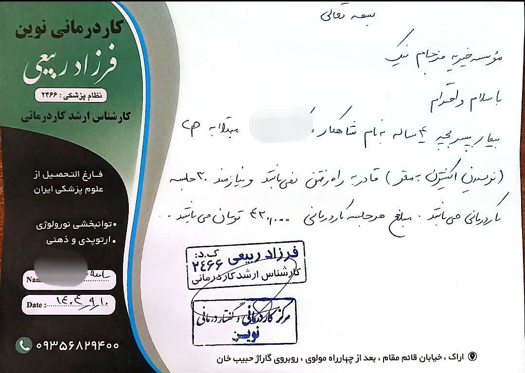پسربچه ۴ ساله مبتلا به CP (موقع تولد اکسیژن به مغز نرسیده) و توانایی راه رفتن ندارد. خانواده دارای فرزند دوقلو بوده که یکی از بچه ها دچار بیماری شده پدر کارگر ساده مستاجر بوده و توانایی پرداخت هزینه های درمان فرزندش را ندارد