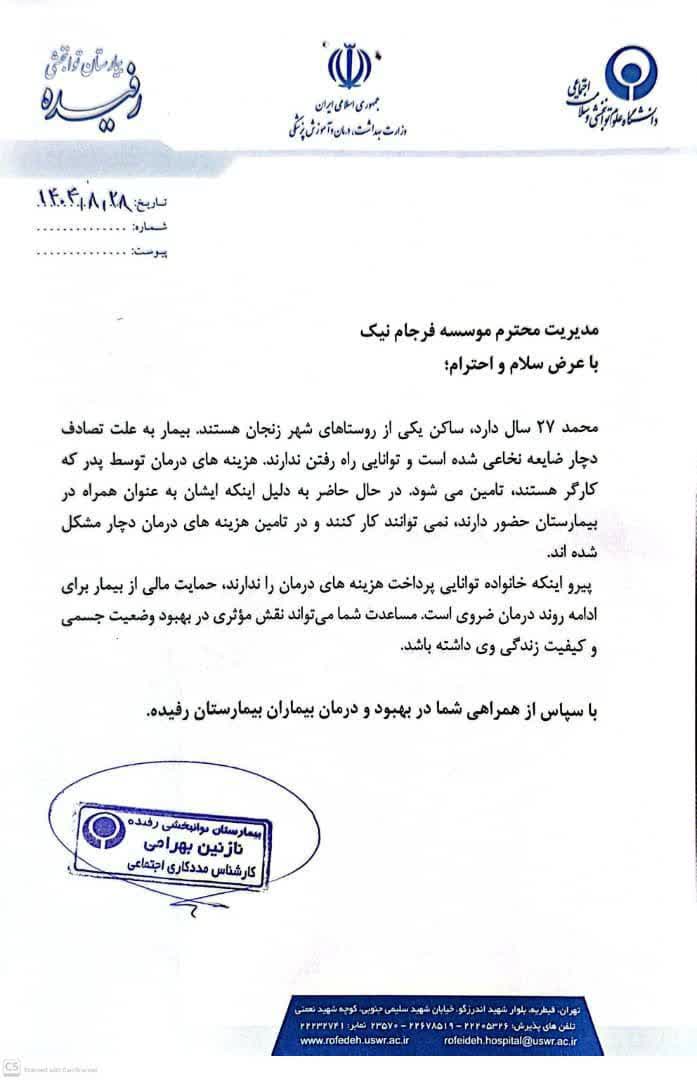 بیمار آقای ۲۷ ساله به دلیل سانحه تصادف دچار ضایعه نخاعی شده و قادر به راه رفتن نیست.پدر بیمار کارگر ساده و به دلیل همراه بودن با فرزندش درحال حاضر بیکار بوده و درآمدی ندارد و برای هزینه های درمان نیازمند یاری خیرین بزرگوار می باشد.